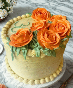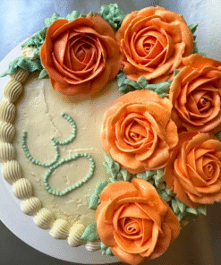 Delicately designed, this buttercream cake showcases six hand-piped roses at its centre, complemented by simple, elegant piping for a timeless finish. Ideal for meaningful occasions, it’s crowned with the sweet sentiment: ‘With Love.’ – a reminder that the simplest gestures often mean the most.