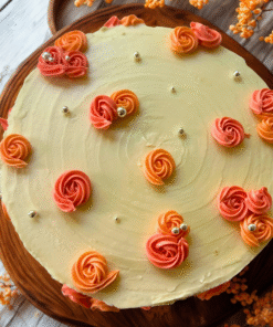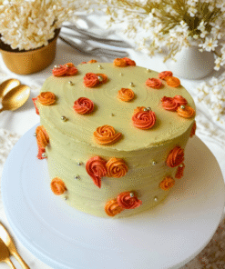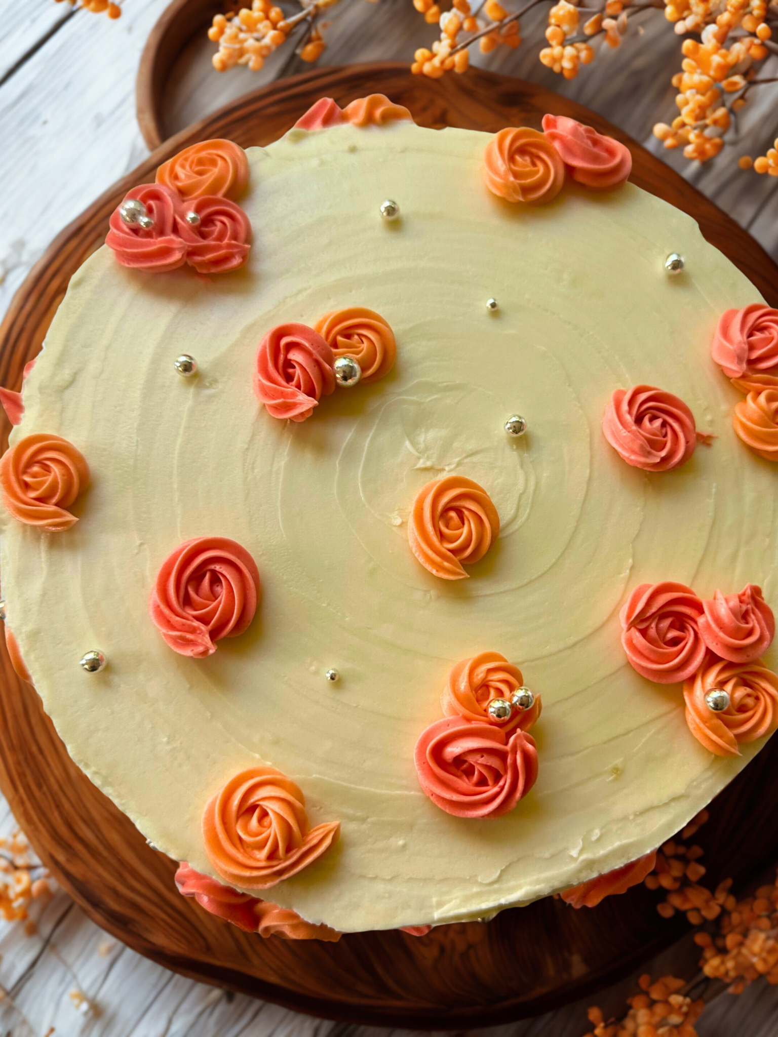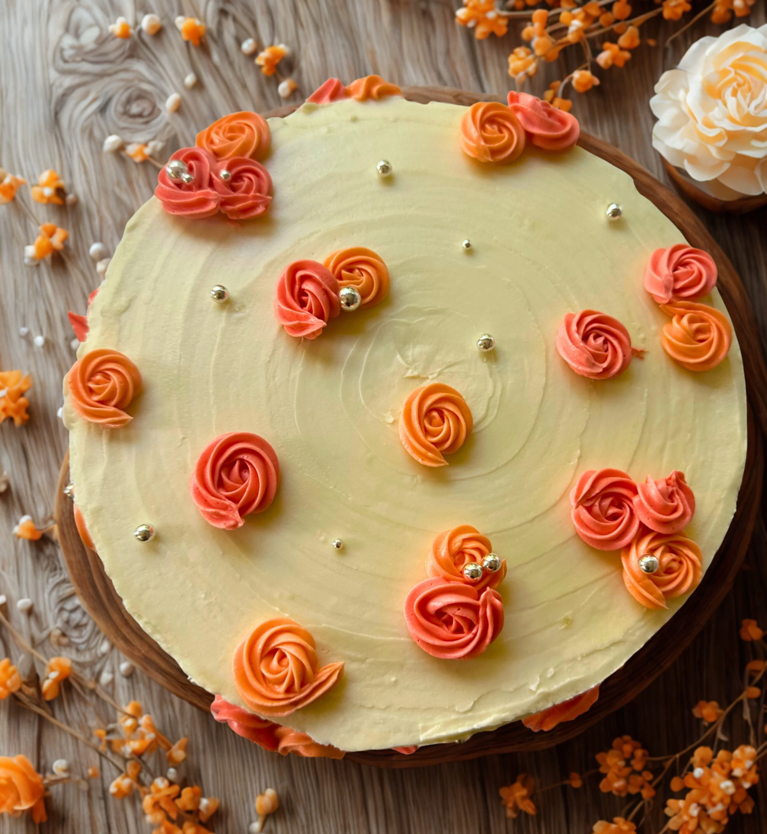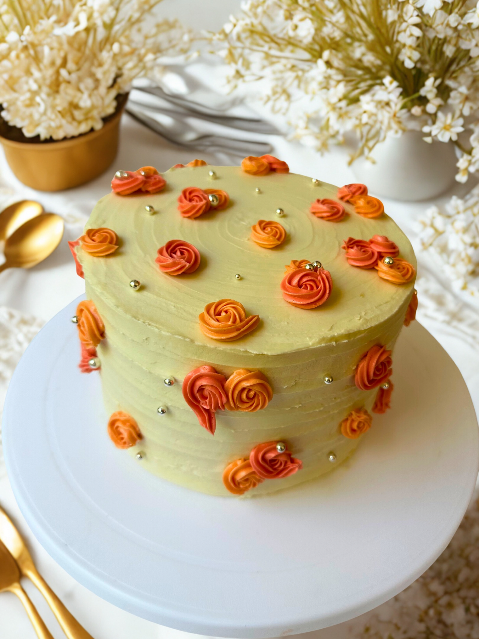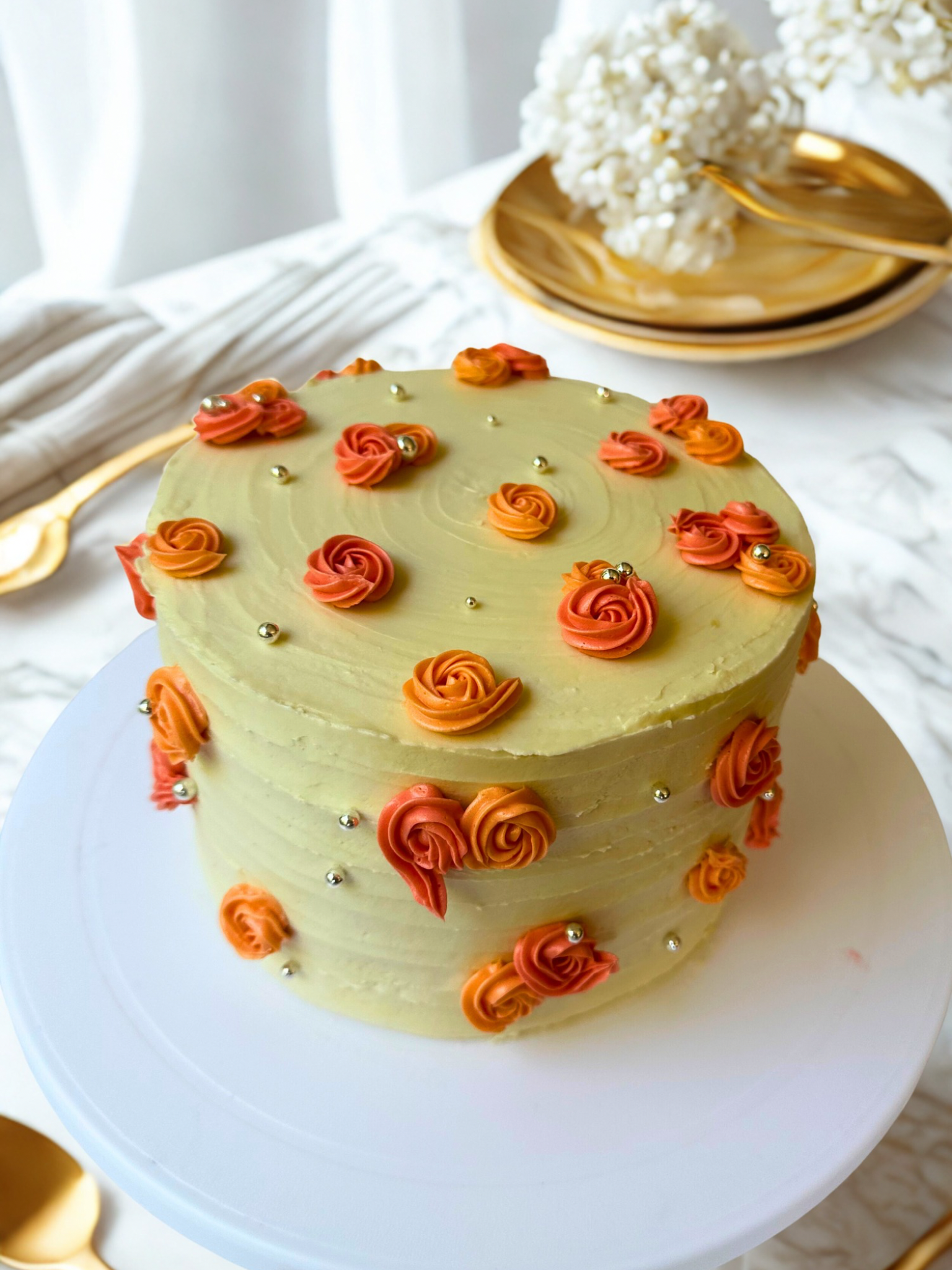 This elegant cake showcases two-toned buttercream rosettes delicately arranged across the cake, accented with shimmering edible pearls. Simple yet refined, it’s perfect for birthdays, celebrations, or any occasion that deserves a touch of beauty.